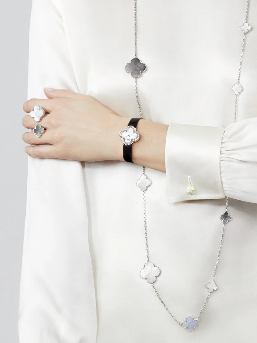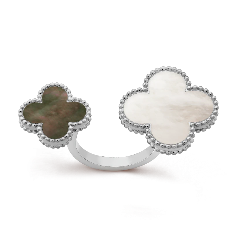 Magic Alhambra ring between the fingers. rhodium-plated 18K white gold. white and gray mother-of-pearl.